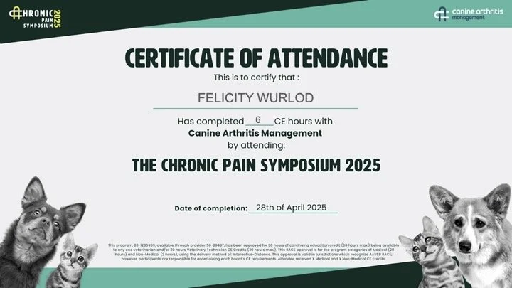 Felicity’s desire to work directly with animals in a non-invasive, science-backed capacity led her to therapeutic massage. She became a certified Clinical Canine Massage Practitioner through the Canine Massage Therapy Centre in the UK, studying under Natalie Lenton, and later earned a Certificate in Equine Sports Massage with Jessica Blackwell at Equestricare in Western Australia. She has also added a Certificate in Photonic Therapy from Ros Maindock of Equestricare to her qualifications, and attended a workshop with Jim Masterson, the renowned founder of the Masterson Method. More recently she completed an introductory course in Canine Craniosacral Therapy with Rebeccah Baylis of IAAT, a professional organisation of which Felicity herself is a member.