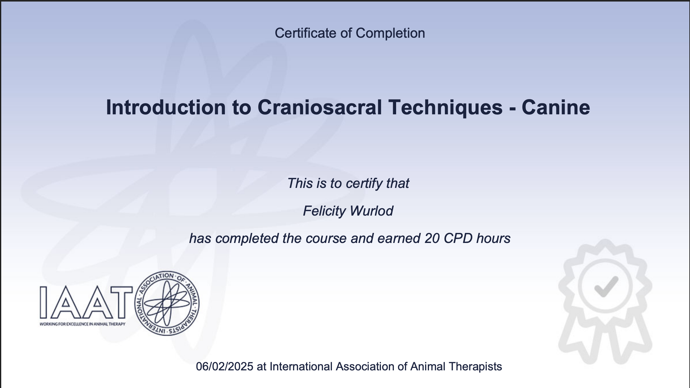 Felicity actively pursues ongoing professional development each year to meet the rigorous standards of her IAAT membership.